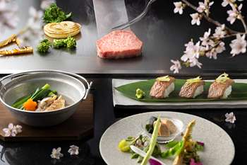桜鯛や桜えび、桜飯など桜をキーワードにした食材や料理を取り揃えた春ならではのコース。牛肉は2種類お愉しみいただけ、とろける味わいの「近江牛」は炙り寿しに、メインでは「大和牛」サーロインを焼き上げます。